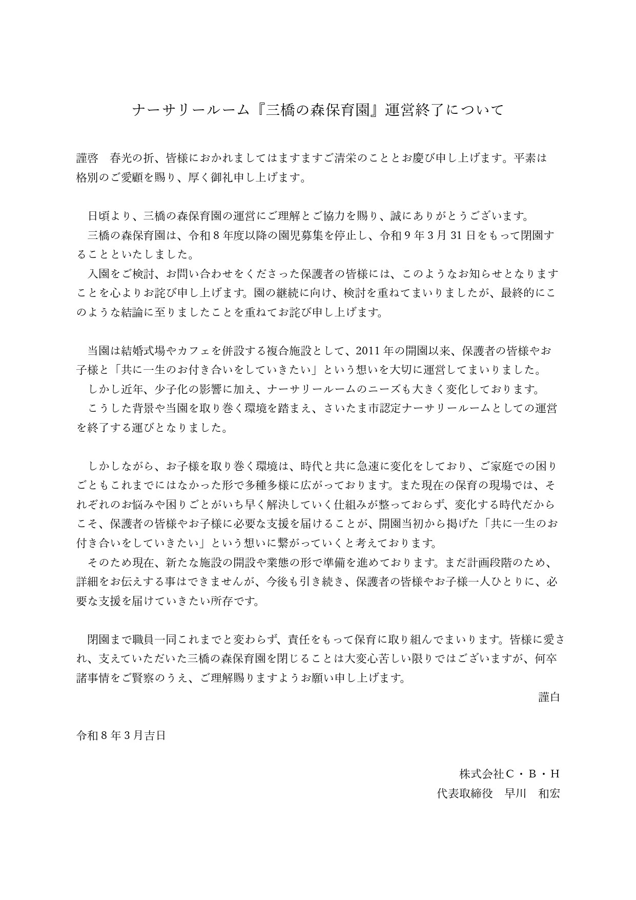 三橋の森保育園は、令和8年度以降の園児募集を停止し、 令和9年3月31日をもって閉園することといたしました。 詳細につきましては、下記のご案内にてご確認いただきますようお願いいたします。